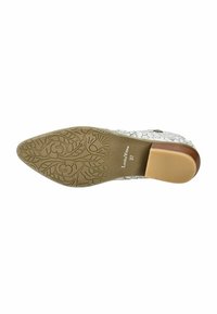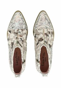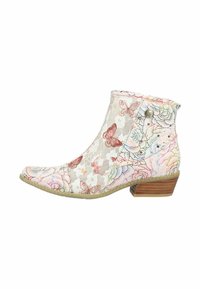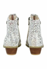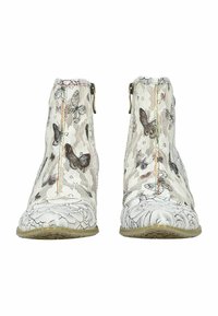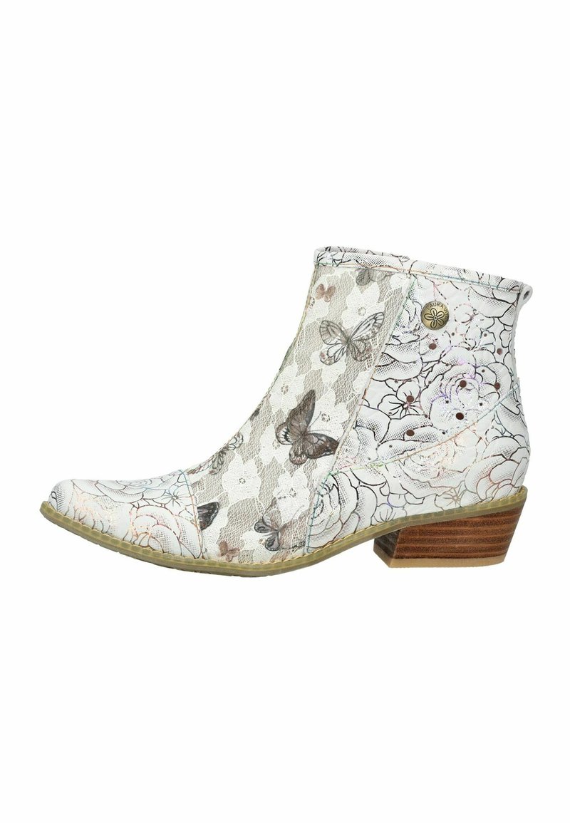 Witte enkellaars met bloemen- en vlinderpatronen, lage gestapelde houten hak en een decoratieve metalen knoop aan de zijkant.