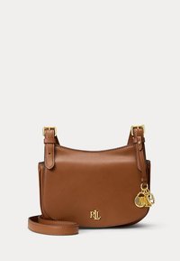 Bruine leren crossbodytas met verstelbare banden, gouden "RLL"-logo en hangende gouden sleutelhangers tegen een lichte achtergrond.