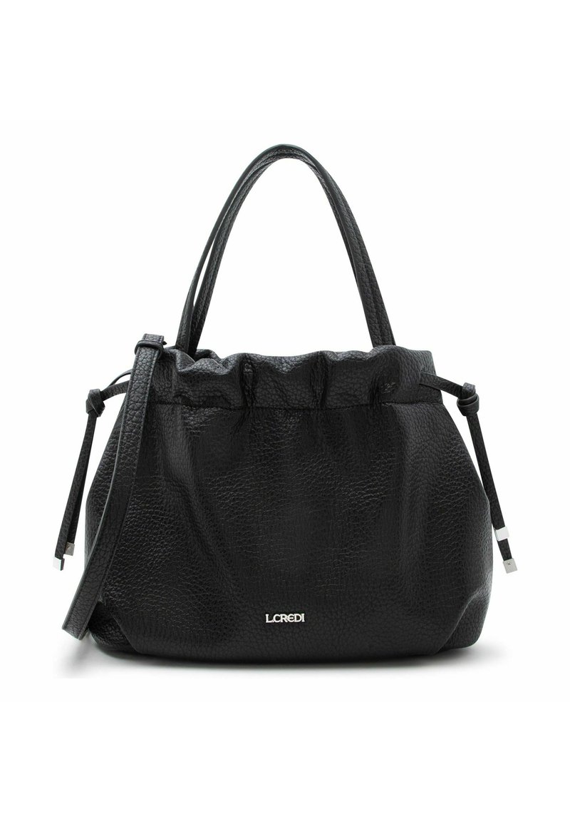 Zwarte handtas van getextureerd leer met geplooide bovenkant, twee handvatten, verstelbare schouderriem en zilveren L.CREDI-logo aan de voorkant.