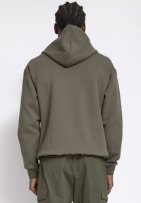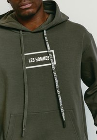 Jonge man met gevlochten haar, gekleed in een olijfgroene hoodie met de tekst "LES HOMMES" en bijpassende broek, staande tegen een effen achtergrond.