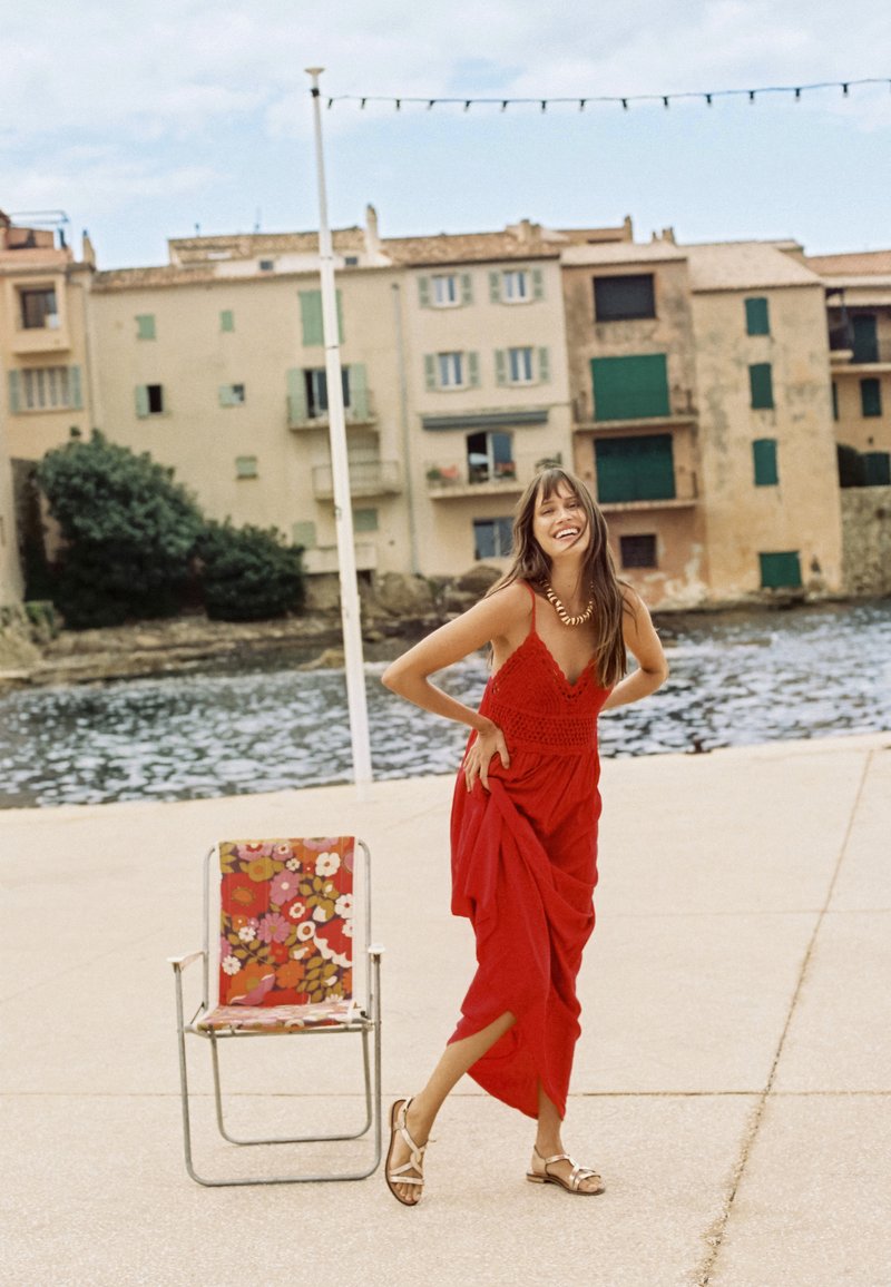 Vrouw in een rode jurk en sandalen staat glimlachend naast een stoel met een bloemenpatroon bij het water, met oude gebouwen op de achtergrond.