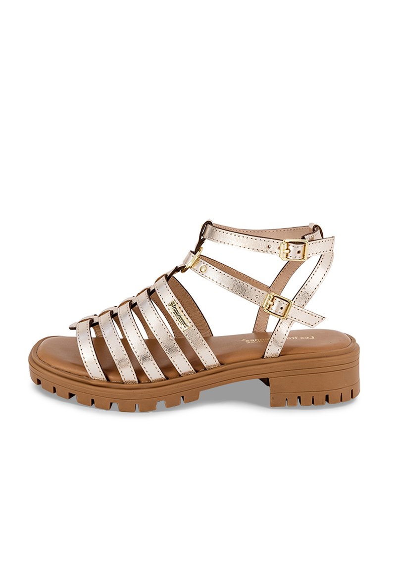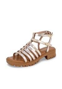 Sandaal met bandjes in een metallic lichtgouden afwerking, voorzien van verstelbare gespen, een gevoerde binnenzool en een dikke, gestructureerde rubberen zool.