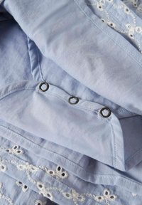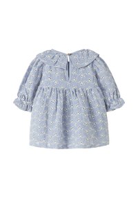 Lichtblauw babyjurkje met witte bloemenborduur, lange mouwen met ruches aan de manchetten en een geruchte kraag met knoopsluiting aan de achterkant.