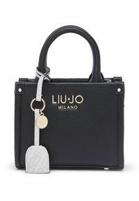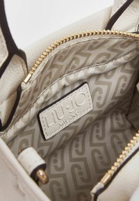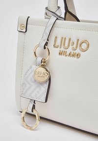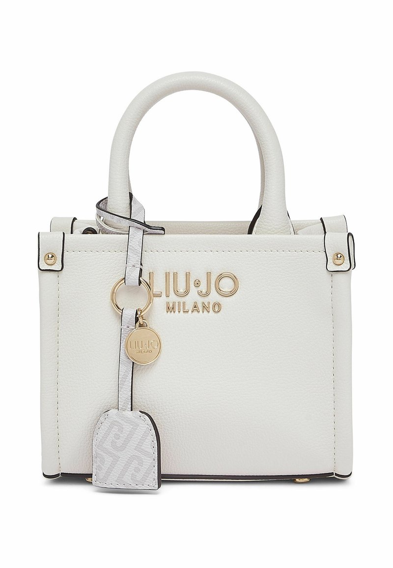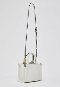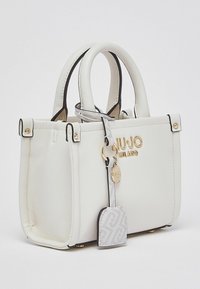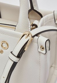 Witte leren handtas met gouden hardware, een gestructureerde vorm, dubbele handvatten en een afneembare riem met een logo bedel.