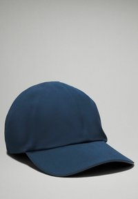 Zwarte pet met een gebogen rand, gemaakt van lichtgewicht materiaal. Het onderwerp draagt een multicolor sporttop met een gestructureerd patroon.