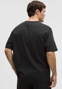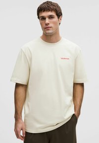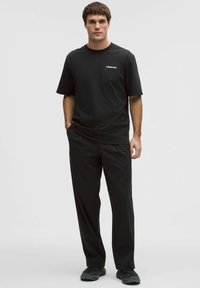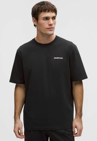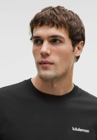 Jonge man draagt een zwart T-shirt met korte mouwen en het 'lululemon' logo op de linkerborst, kijkt naar links tegen een effen achtergrond.