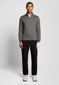 Man die een grijze trui met korte rits draagt met een geel vogellogo, een witte golfhandschoen aan zijn rechterhand en een zwarte broek, staand tegen een grijze achtergrond.