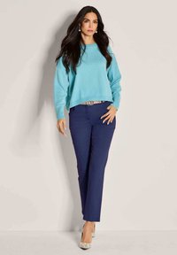 Marineblauwe, rechte broek met een gladde textuur, voorzakken en een knoopsluiting. Gemaakt in combinatie met veelkleurige, gemusterde hakken.