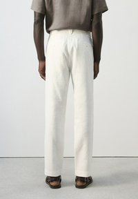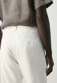 Man draagt witte rechte broek, een loshangend kortbruin overhemd met korte mouwen en donkerbruine sandalen met open tenen, staand op een grijze vloer.