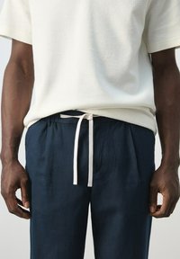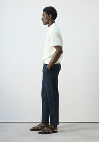 Man draagt marineblauwe broek met trekkoord, wit kort mouwen shirt en bruine leren sandalen, staande tegen een effen achtergrond.
