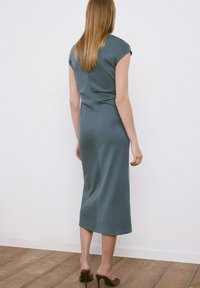 Vrouw met lang blond haar, gekleed in een nauwsluitende, mouwloze grijsblauwe jurk, staand tegen een witte muur.