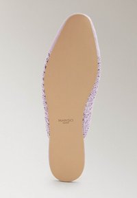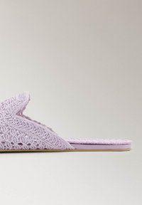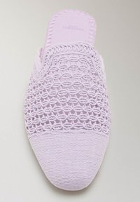 Lila instap-muil met puntige neus, voorzien van een ingewikkeld haakpatroon en platte zool, zijaanzicht op witte achtergrond.