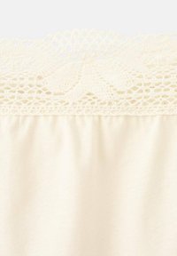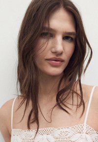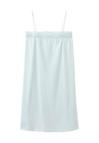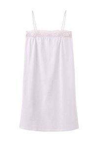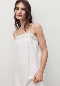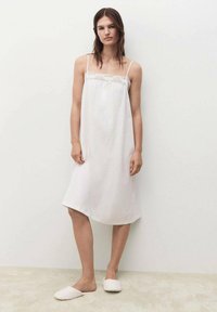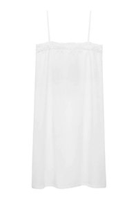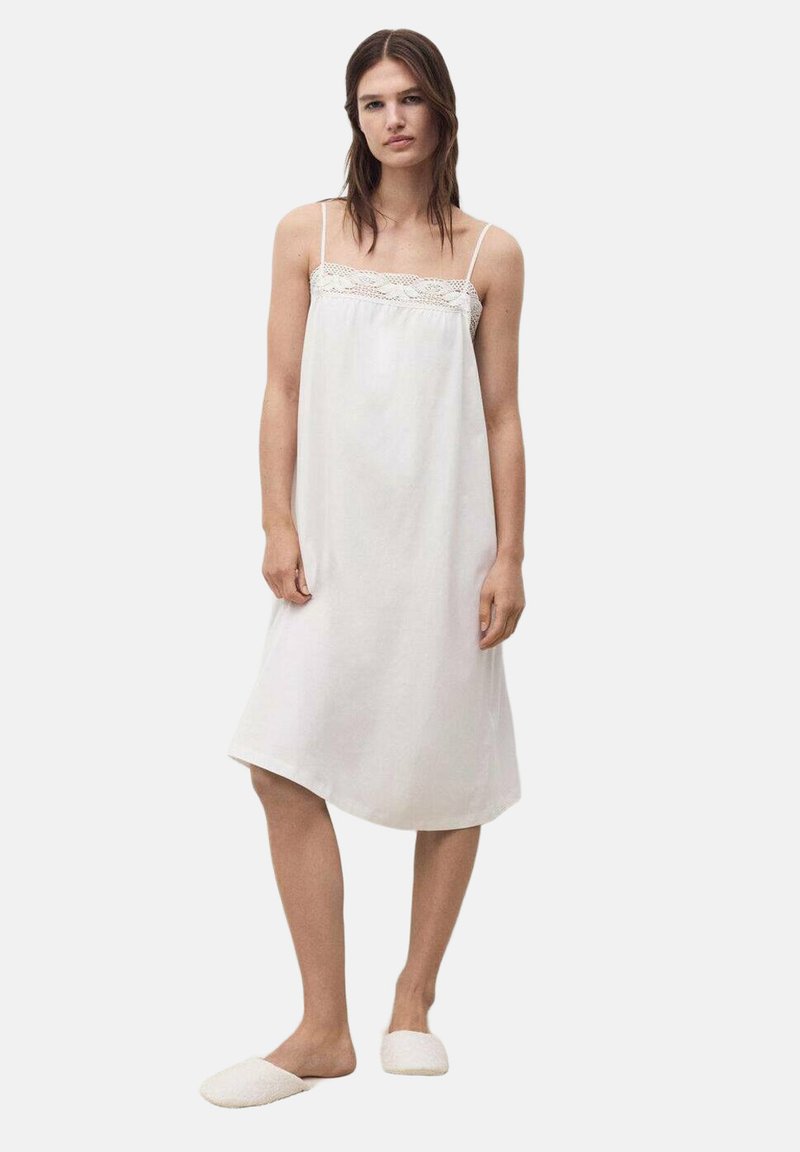 Vrouw staand, gekleed in een mouwloos wit nachthemd met kanten details en witte slippers, tegen een effen lichte achtergrond.