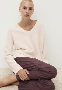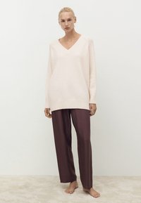 Lichtroze gebreide trui met een ontspannen pasvorm, geribbelde manchetten en onderrand, zachte textuur en raglanmouwontwerp, gezien vanuit de achterkant.