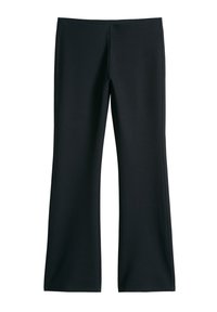 Zwarte wijde leggings gemaakt van rekbare stof, met een hoge tailleband en een gladde textuur. Gecombineerd met witte sneakers.