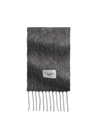 Vrouw met een rode gebreide muts, een bordeauxrode top met lange mouwen, zwarte broek met hoge taille en een lange grijze sjaal met een wit label.