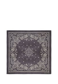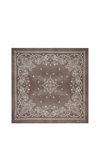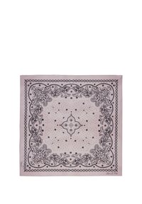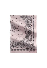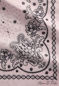Vrouw met lang donker haar draagt een lichtroze top met lange mouwen en een lichtroze sjaal met zwarte patronen losjes om haar nek geknoopt.