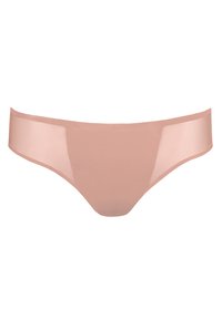 Witte slip met een doorschijnend meshpaneel aan de zijkanten en een stevige voorkant. Glad textuur met een eenvoudige elastische tailleband en minimale naden.