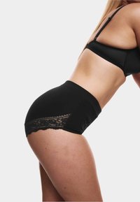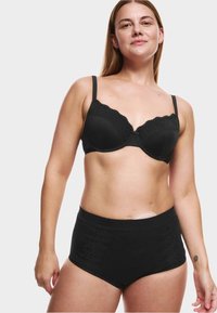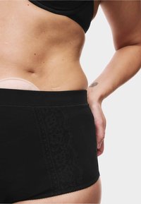 Vrouw draagt zwarte kanten beha en hooggetailleerd ondergoed, toont een medische stoma- opvangzak op haar buik, staand tegen een witte achtergrond.
