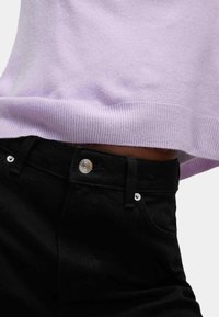 Lichtpaarse trui met ronde hals en lange mouwen, met een gladde textuur. Gecombineerd met een zwarte spijkerbroek en een zwarte riem.