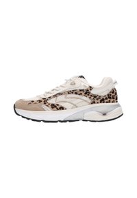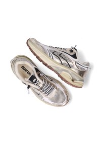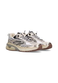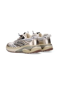 Dikke atletische sneaker met metallic zilver, wit en zwart mesh bovendeel en dikke beige zool, gezien in rechter zijaanzicht.