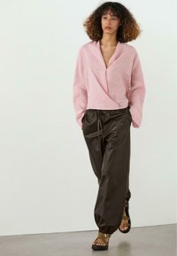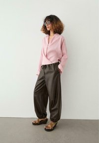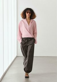 Vrouw met krullend haar die een losse roze wikkelblouse en donkere broek met koord draagt, staand tegen een eenvoudige lichte achtergrond.