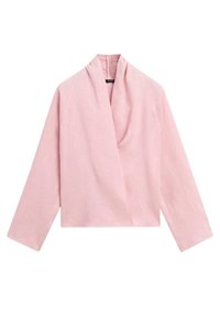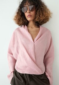 Wijde en ontspannen silhouet, niet getailleerd. V-hals. Lange mouwen. Soepele en lichtgewicht stof. Gedrapeerd detail bij de halslijn. Overslag met verborgen knopen. Blouse gemaakt van 100% linnen stof.