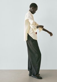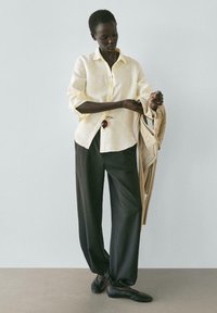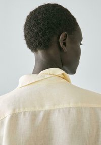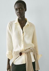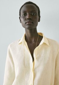 Overhemdkraag. Overhemd van 100% linnen. Lange mouwen met knoopmanchetten. Knoopsluiting op middenvoor.