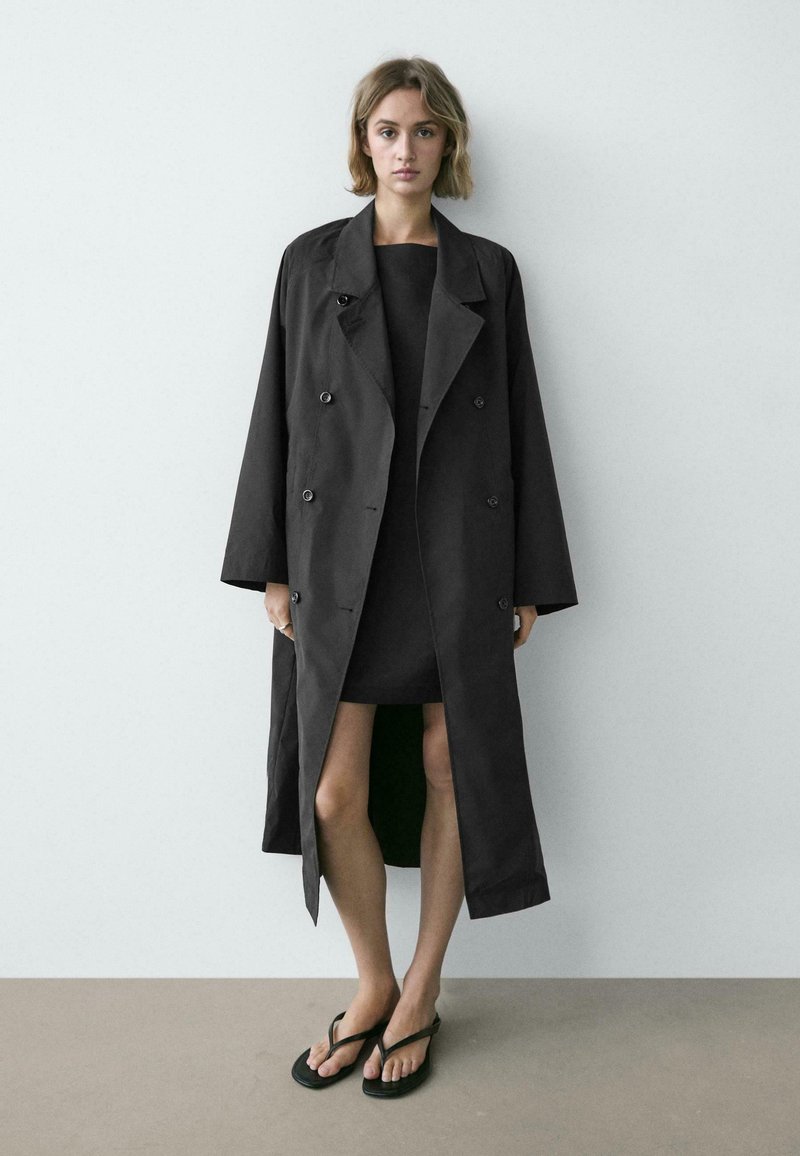 Twee klepzakken. Trenchcoat. Split op middenachter. Reverskraag met inkeping. Lange mouwen. Double-breasted knoopsluiting.