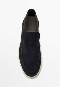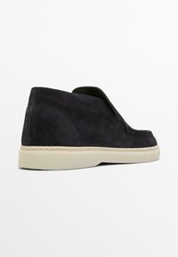 Moc toe detail. Gemaakt van rundleer met suède afwerking. Leren voering en binnenzool. Contrast.