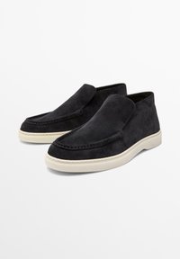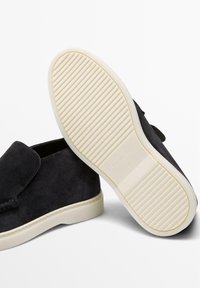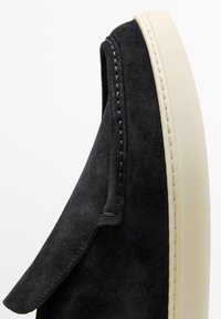Zwarte suède instapper met witte rubberen zool, lage enkelhoogte en mocassin-achtige stiksels rond het teengebied.