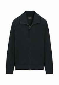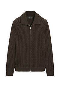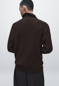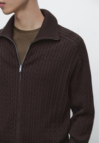 Geribbelde afwerkingen. Lange mouwen. Hoge kraag. Cardigan gemaakt van gebreid stof met katoen. Gevlochten detail.