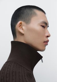 Jonge man met kort haar, gekleed in een bruine kabelgebreide trui met rits over een bruin shirt, staand tegen een effen lichte achtergrond.