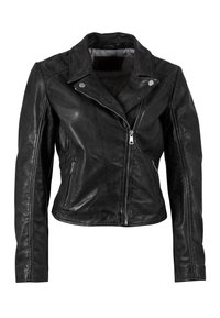 Zwarte leren motorjack met een getailleerd ontwerp, voorzien van een asymmetrische ritssluiting, twee voorzakken en een gladde textuur.