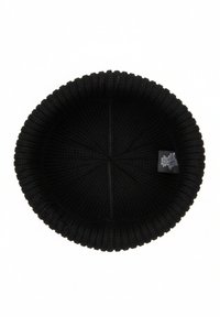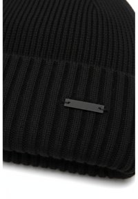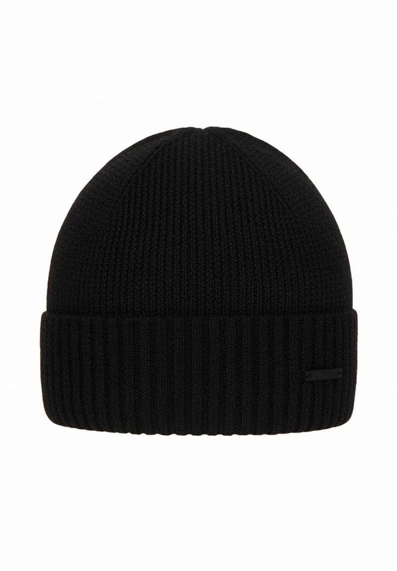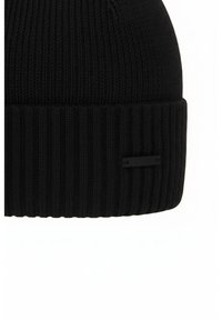 Zwarte gebreide muts met een geribbelde textuur, voorzien van een omgeslagen boord en een klein zwart label. Glad oppervlak met een afgerond bovenontwerp.