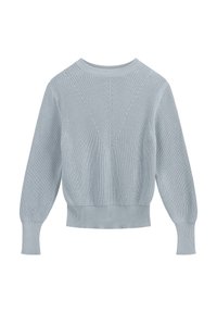 Lichtblauwe gebreide trui met een ronde hals, met een gestructureerd V-patroon aan de voorkant en geribde manchetten en zoom.