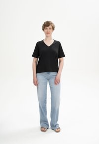 Zwart katoenen V-hals T-shirt met korte mouwen, losse pasvorm, gecombineerd met lichtblauwe jeans. Soepele textuur, minimalistisch ontwerp, geen patronen of accenten.