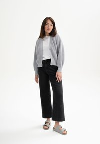 Grijze geribbelde cardigan met een V-hals, lange ballonmouwen en drie knopen aan de voorkant. Gecombineerd met een wit shirt en zwarte broek.