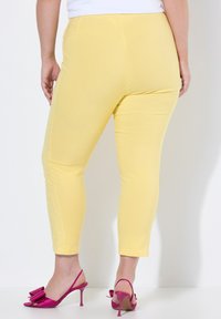 Gele tapered pantalons met een gladde textuur en details van een voornaad, met een omslag aan de onderkant. Gecombineerd met zilveren strappy sandalen.