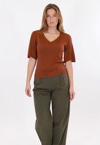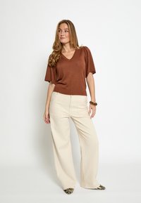 Bruin T-shirt met korte mouwen en V-hals met een lichte, licht glanzende textuur, gecombineerd met crèmekleurige broek met wijde pijpen.