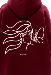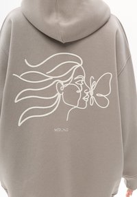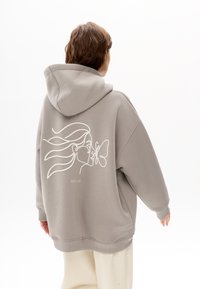Oversized grijze hoodie van zachte stof, met een witte lijntekening van een gezicht en een vlinder op de achterkant.