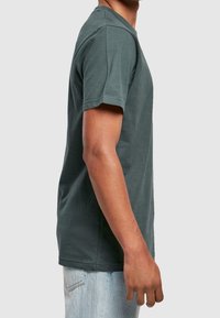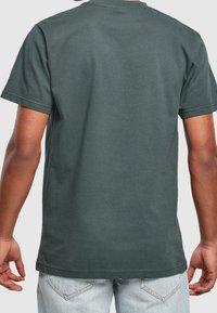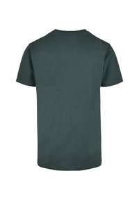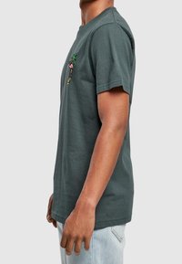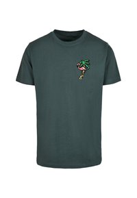 Donkergroen katoenen T-shirt met korte mouwen, met een klein geborduurd ontwerp van een roze flamingo en een palmboom op de linkerborst.