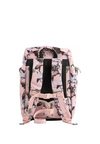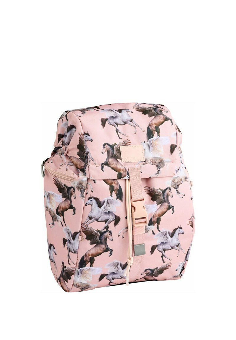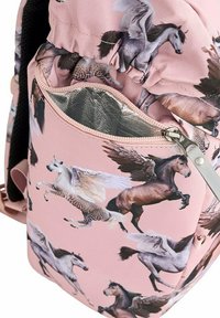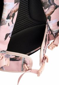 Roze rugzak met een print van paarden in verschillende houdingen. Gemaakt van stof met een gestructureerd oppervlak en een voorste gespband voor sluiting.