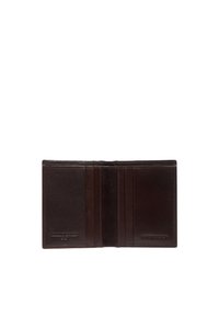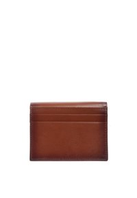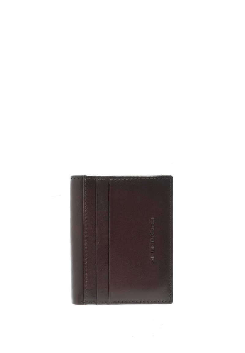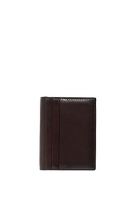 Donkere bruine leren portemonnee met gestikte randen en meerdere kaarthouders, geperst met een subtiel merklogo aan de voorkant.