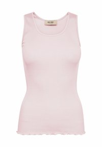 Zwarte geribde tanktop met brede schouderbanden en een ronde halslijn, gecombineerd met een zwarte broek; gladde stofstructuur en nauwsluitend design.
