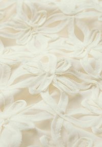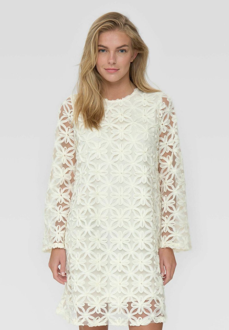 Witte kanten jurk met lange doorzichtige mouwen, versierd met ingewikkelde bloemmotieven en een ronde halslijn, die tot boven de knie valt.