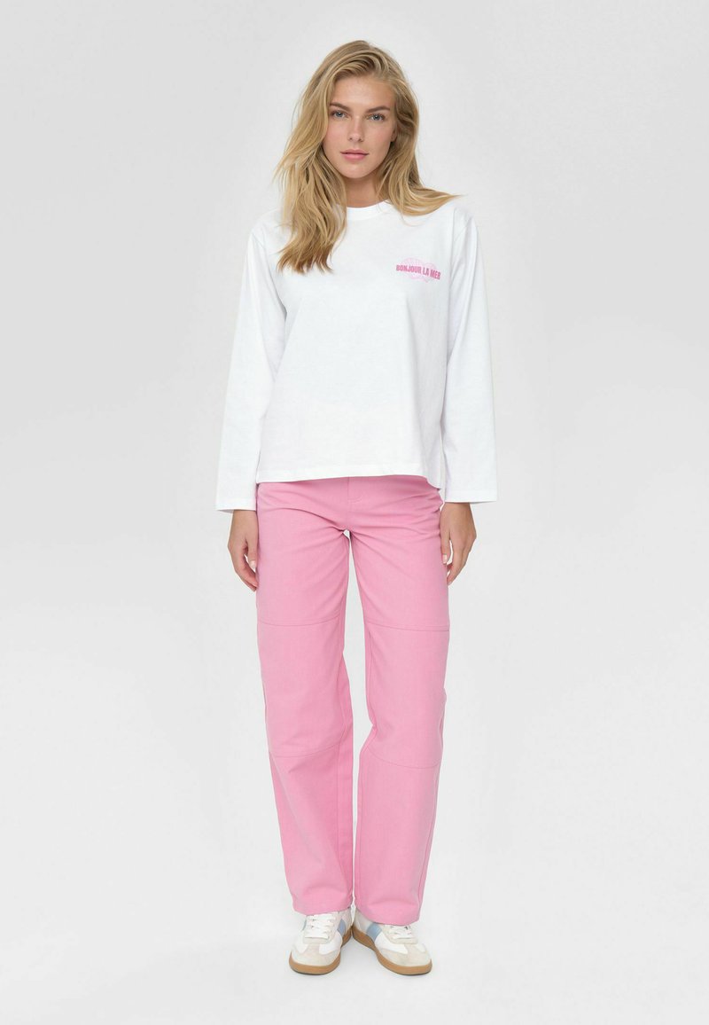 Witte lange mouwen shirt met roze tekst "BONJOUR LA MER", gecombineerd met lichtroze broek. Model draagt beige en witte sneakers.