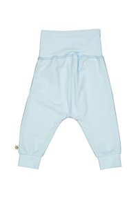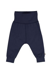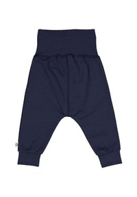 Twee paar kinderpanten: één in marineblauw en één in lichtblauw. Beide hebben hoge taillebanden, elastische boorden en zijn gemaakt van zachte, gladde katoen.