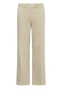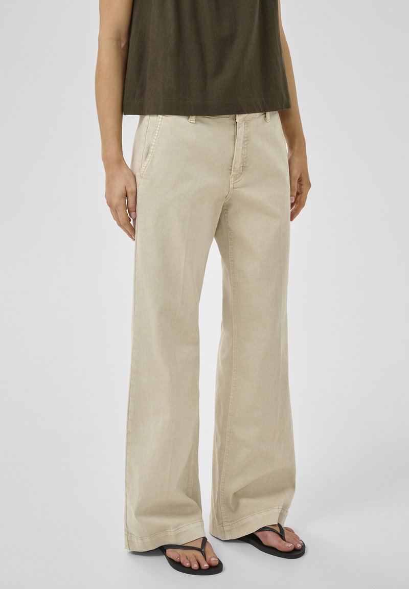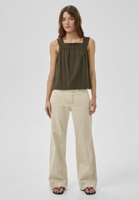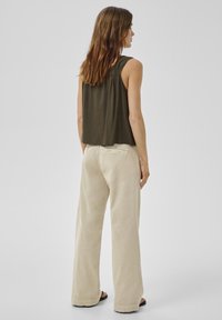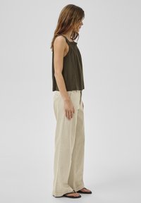 Persoon die beige wijde broek draagt, zwarte slippers en een donker olijfgroen cropped top, staand tegen een effen achtergrond.