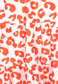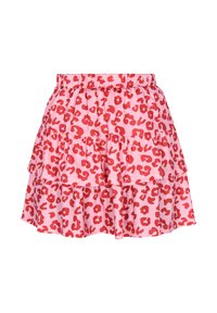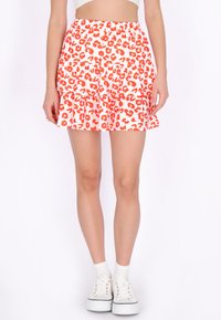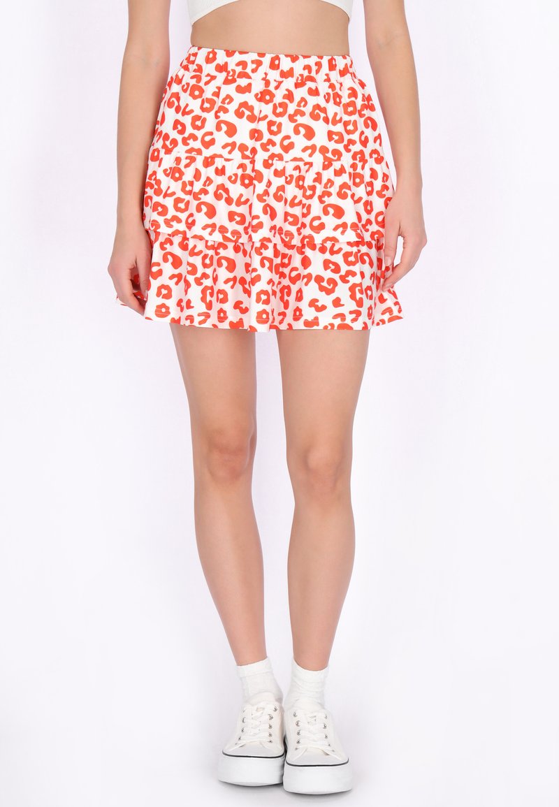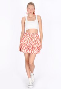 Vrouw draagt een witte en rode minirok met luipaardprint, gecombineerd met witte plateau sneakers en enkelsokken, staand tegen een witte achtergrond.